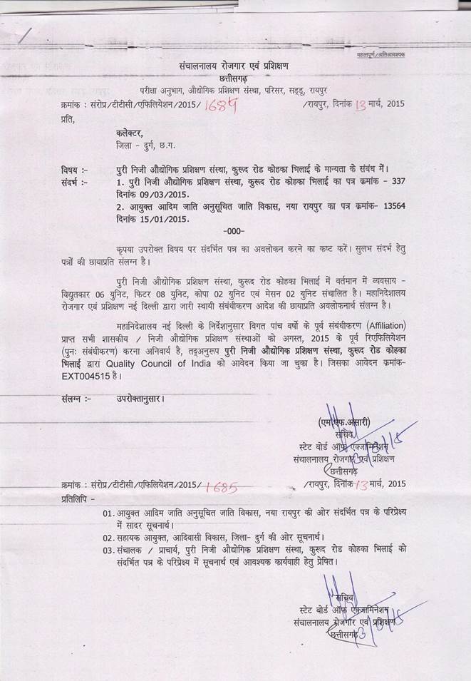 DET/TTC/Affiliation/2015/1684, Raipur, Dated 13/03/2015